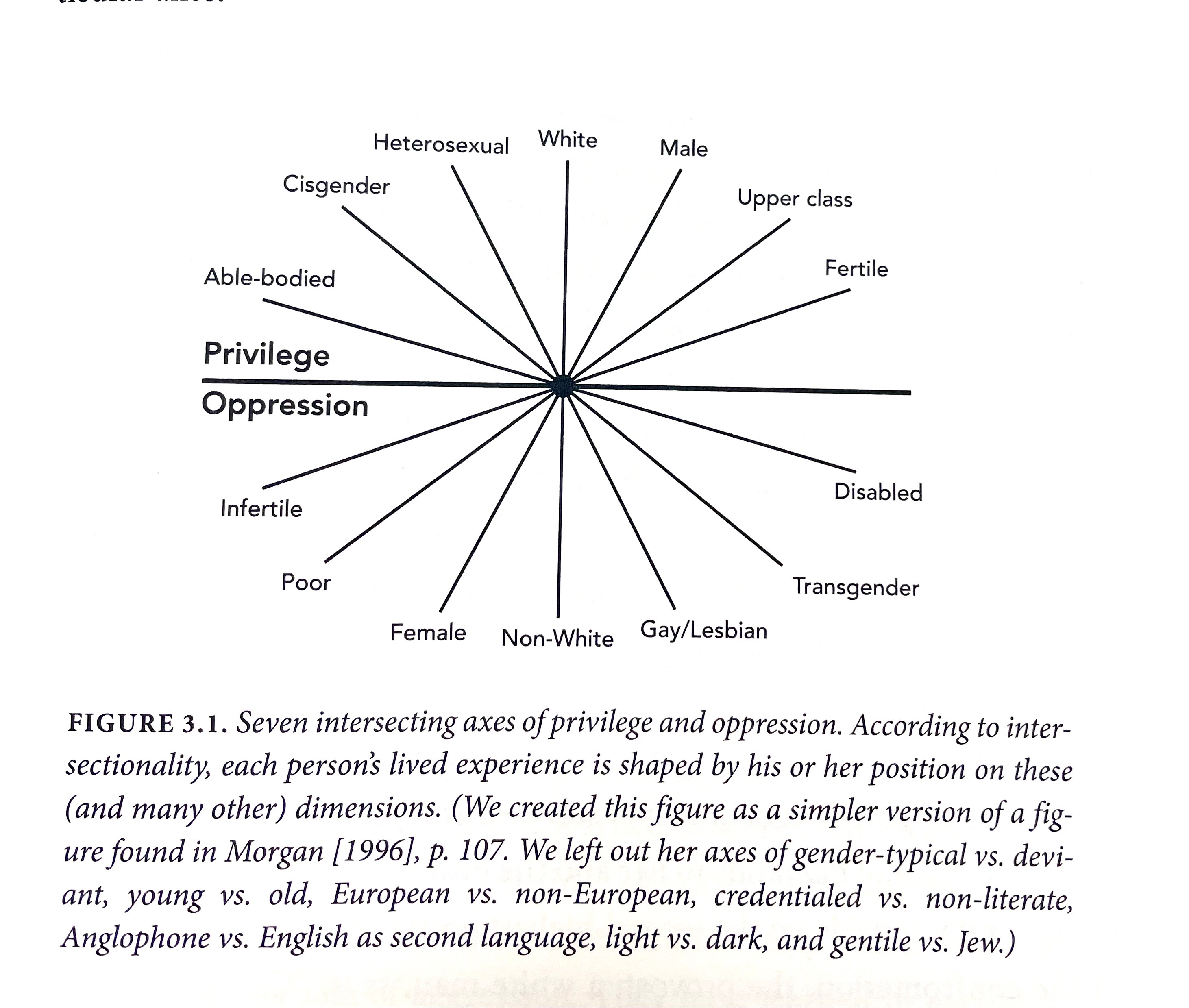 Certain interpretations of Intersectionality end up teaching “bipolar dimensions of privilege and oppression as ubiquitous in social interactions. It's not just about employment or other opportunities, it's not just about race and gender. Figure 3.1 [which I have included below] shows the sort of diagram that is sometimes used to teach intersectionality” (68).