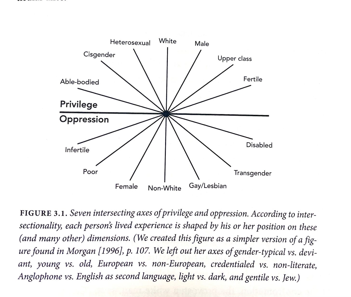 This figure is based on one by Kathryn Morgan of the University of Toronto. She is noted as defining her terms: “privilege involves the power to dominate in systematic ways… oppression involves the lived, systematic experience of being dominated by virtue of one's position on various particular axes” (68-9).