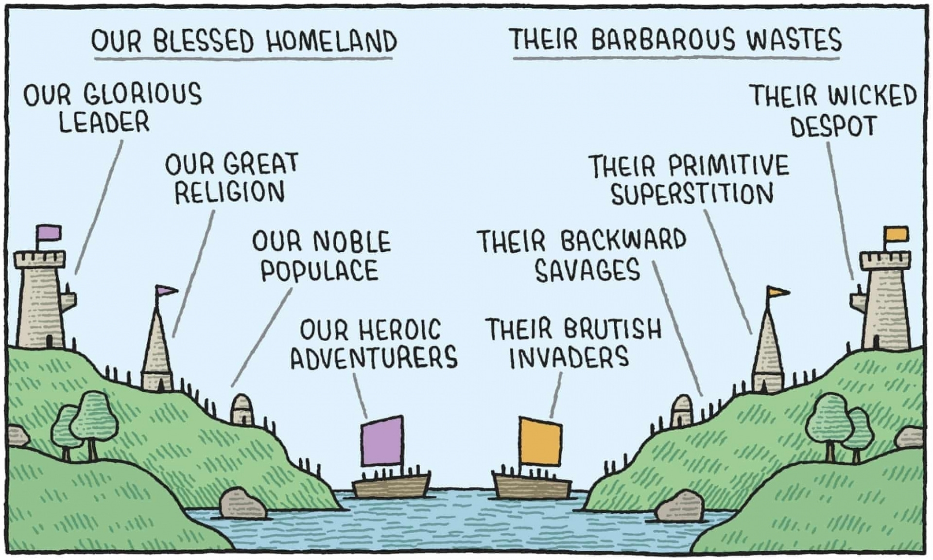 In fact, this builds a kind of cognitive distortion in a student or person, a cognitive schemas of “Life is a battle between good people and evil people” (70). This of course plays right into the hands of tribalism.